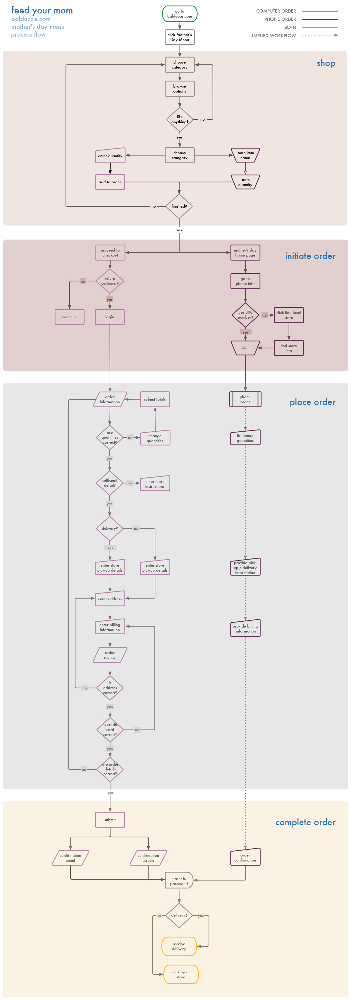 Data visualization representing process that involves multiple actors and stages. Parallel flows demonstrate online and offline (phone) orders. Color blocks visually group tasks into phases.