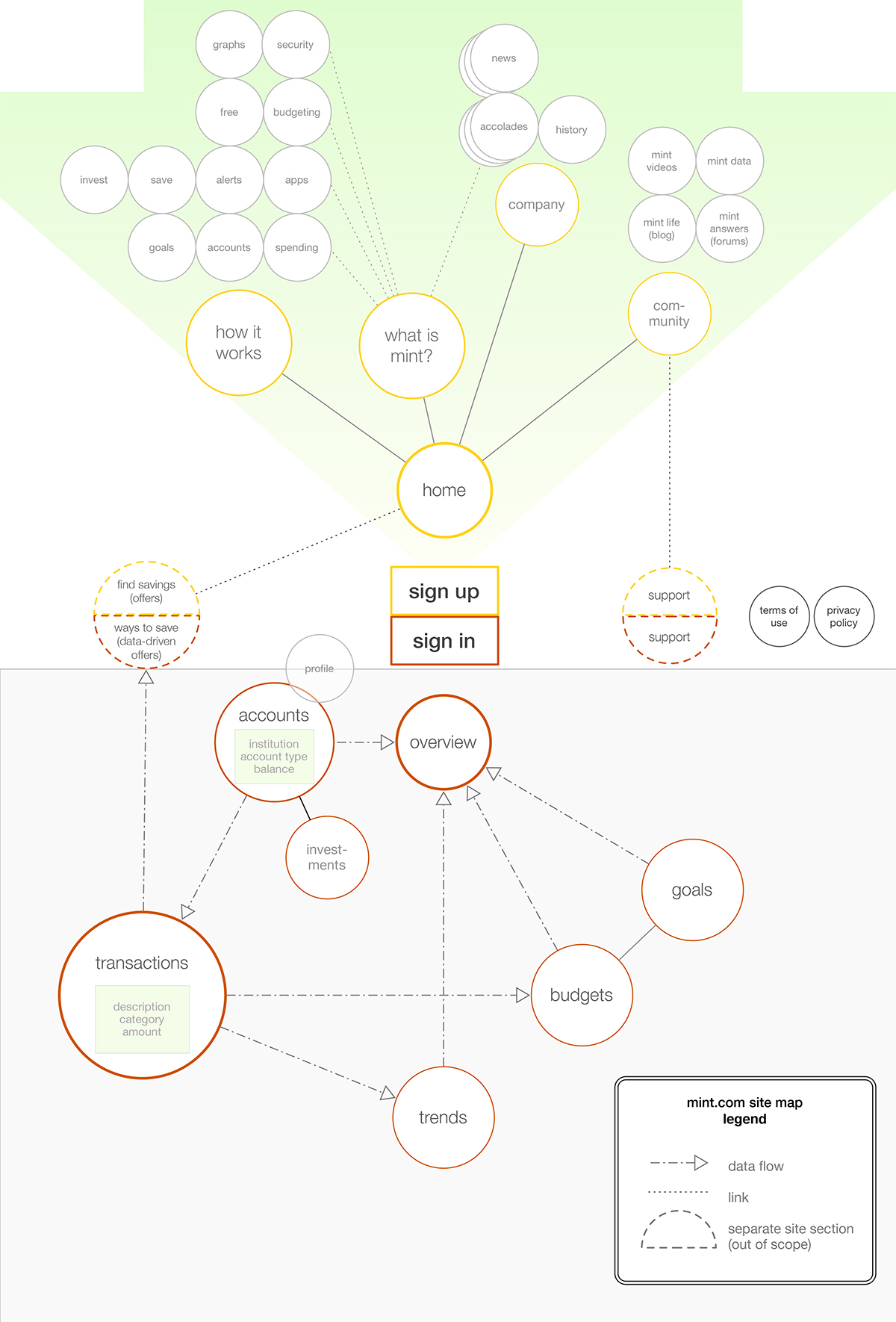 Because of differences between signed-in and signed-out states, the traditional "org chart" site map structure didn't apply. Instead, the diagram is split into two nodal maps: