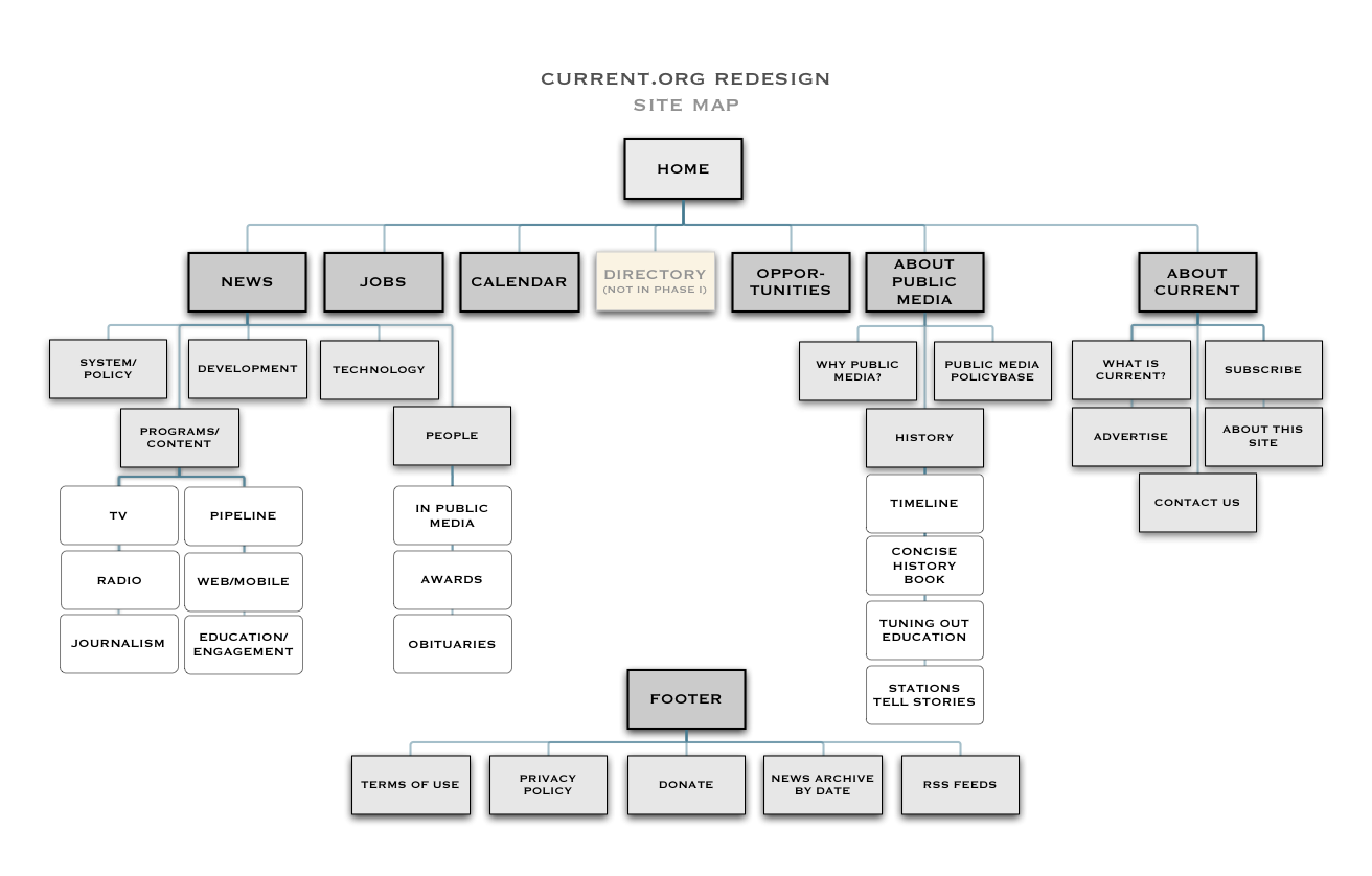 Conventional site map reflecting new information architecture for rebuild of current.org, a public media news site. Captures updated content structure hierarchy. Created after content audit and gap analysis.